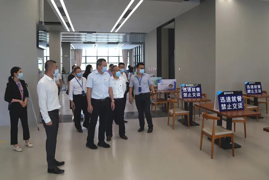 李丁文一行首先来到深圳技术大学公共教学楼,实地考察了我校网络课堂开展、教室座位设置等相关教学准备情况,观看了我校招生宣传片及疫情防控演练视频,并重点查看了学校防疫物资准备情况。随后,调研组实地检查了学校北区宿舍及北区食堂,对学生返校后的住宿、用餐安排深入了解并提出指导意见。